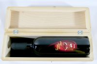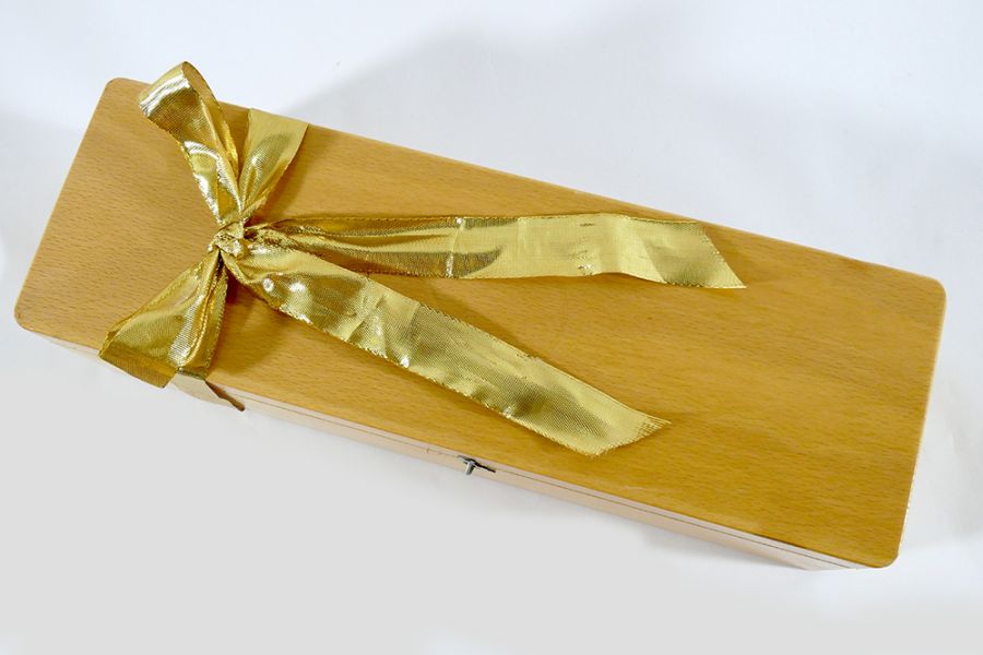 Cutia este din lemn natur lacuit, are inchizatoare metalica si este decorata cu panglica aurie.