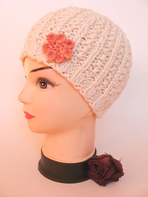 Caciula tricotata din fir de PNA crem cu floricica aplicata
