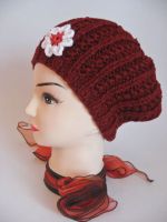 Caciulita tricotata din fir gros de PNA bordo si floricica crosetata si aplicata