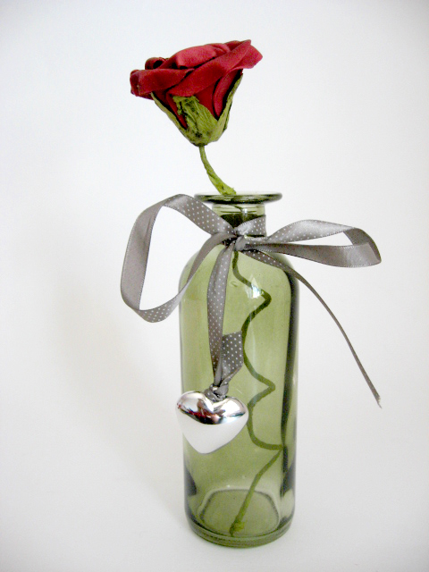 Vaza din sticla verde decorata cu inimioara argintie si panglica satinata