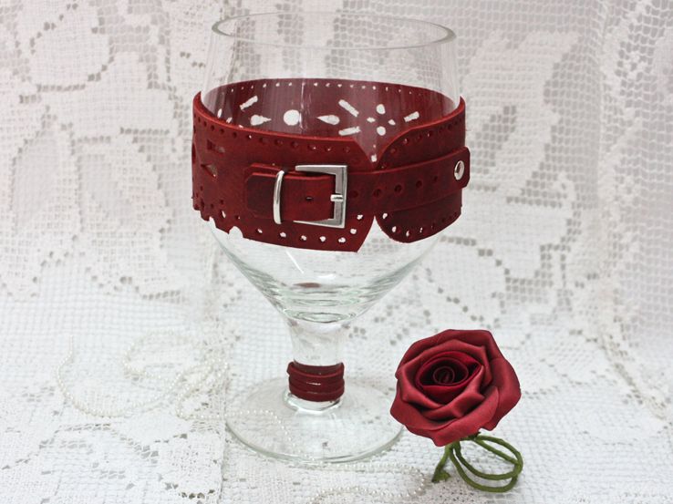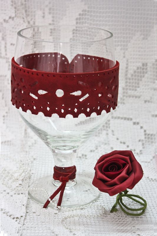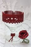 Vas decorativ tip pahar din sticla decorat cu piele rosie
